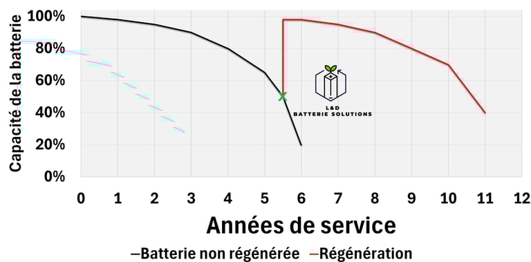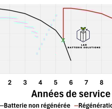 Cette opération double la durée de vie de la batterie, qui retrouve entre 90 % et 100 % de sa capacité initiale*, avec une courbe de décharge identique à celle d’origine. Ainsi, une batterie affaiblie après 5 d’utilisation retrouvera un comportement similaire après 5 nouvelles années suivant sa régénération.